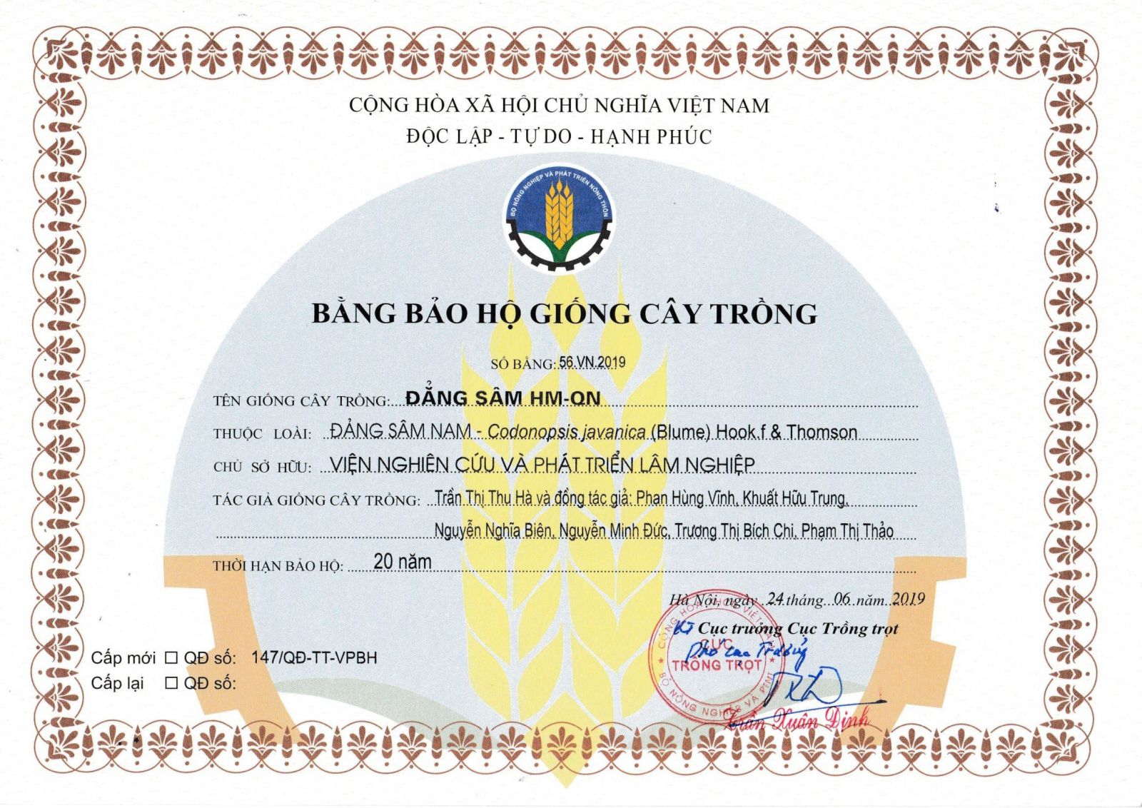 Bằng bảo hộ giống cây trồng Đẳng sâm